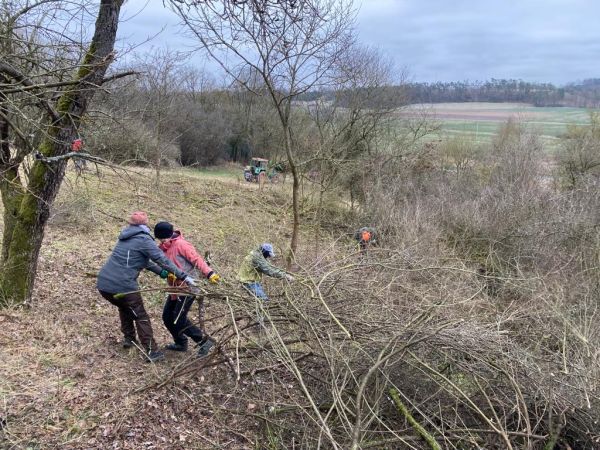 Ein gutes Dutzend Freiwillige waren im Februar an drei Samstagen aktiv, um den Gebüschen am „Hammelein“ in Wilhermsdorf zu Leibe zu rücken. Das Hammelein ist eine magere Wiesenfläche, die seit Jahrzehnten über den Landschaftspflegeverband Mittelfranken als Naturschutzfläche betreut wird. Hier gibt es noch viele seltene Pflanzenarten, die sonst im Landkreis Fürth kaum noch zu finden sind. Heckenbrütende Vogelarten finden hier ein Eldorado. Allerdings sind die Schlehenhecken in den letzten Jahren immer weiter in die fingerförmig am Hang liegenden Wiesenabschnitte hineingewachsen. Um dem entgegen zu arbeiten, wurden die Schlehen an einigen Stellen entfernt. Nun gibt es auch wieder Verbindungen zwischen den vorher getrennten Magerwiesen, so dass Heuschrecken und Käfer von einer Wiese auf die andere wechseln können. Die Aktion war ein Gemeinschaftsprojekt des Landschaftspflegeverbands mit dem Bund Naturschutz und Landwirten aus Wilhermsdorf. Die Gemeinde übernimmt ein Viertel der Kosten – den Rest zahlt das bayerische Umweltministerium.