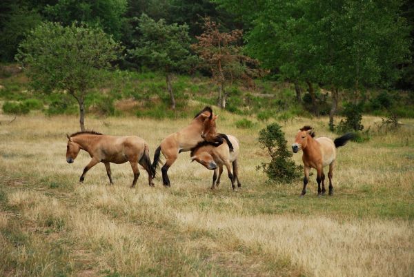 “Yper und Yzop kommen aus einer Außenstelle des Prager Zoos in Dolní Dobřejov, wo sie mit anderen Hengsten in einer Junggesellengruppe zusammengelebt haben. Vor allem Yzop hat sich schon beim Aussteigen den älteren Hengsten gegenüber entsprechend selbstbewusst gezeigt, und mit dem vierjährigen Khan ausgiebig gerangelt”, so Gebietsbetreuerin Verena Fröhlich vom Landschaftspflegeverband, die sich zusammen mit ihrer Kollegin Wiebkea Bromisch um das Beweidungsprojekt kümmert. Abgesehen von ein paar harmlosen Schrammen, wie sie unter Hengsten häufig vorkommen, habe es dabei aber keine Verletzungen gegeben. “Auch nach 20 Jahren ist es für uns immer noch aufregend, wenn neue Tiere zu uns kommen - und oft genug überraschen uns die Hengste dann auch mit unerwartetem Verhalten”, berichtet Wiebkea Bromisch. “Wir sind sehr gespannt, wie sich Yzop und Yper einleben werden, mit wem sie sich anfreunden, und wie sich die Gruppenstruktur in den nächsten Wochen entwickeln wird”. Eines ist jedenfalls sicher: langweilig wird es mit den “wilden Hengsten” im Tennenloher Forst nie!