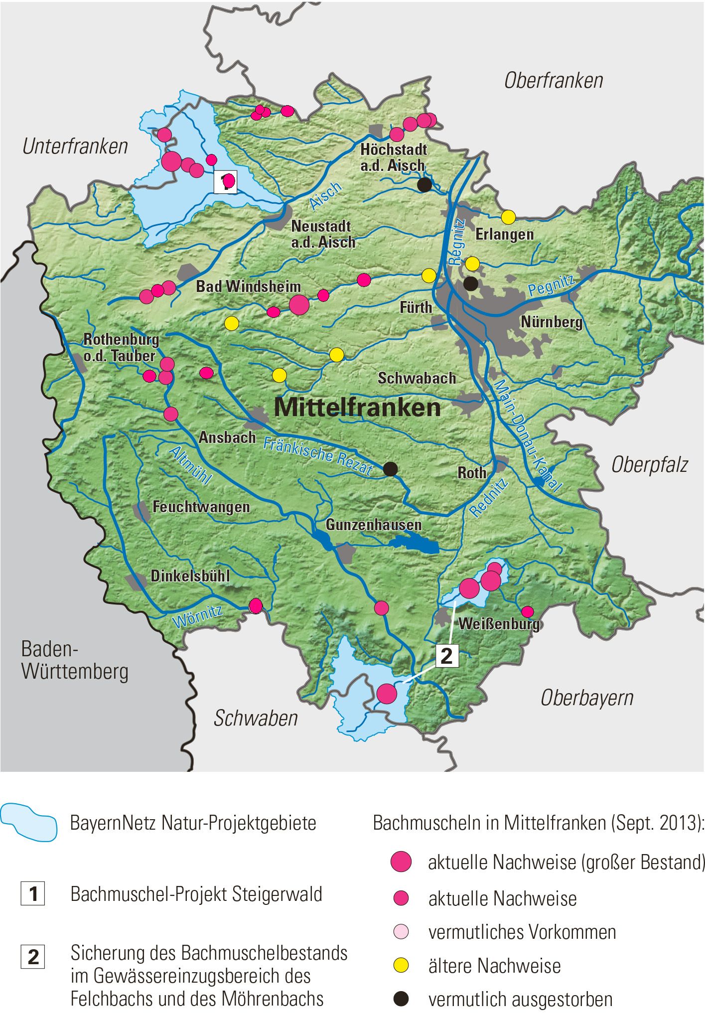 Nähere Informationen zur Biologie, den für die Fortpflanzung notwendigen Wirtsfischen, zu Gefährdung und Schutzmaßnahmen finden Sie in unserem Flyer "Bachmuscheln in Mittelfranken" und auf den Seiten unserer Projektpartner.
